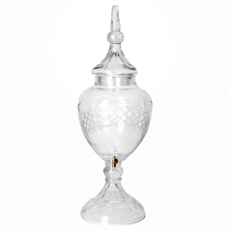 A beautiful show-stopping drink dispenser in an ornate, antique style. Featuring cut glass and a brass tap. Measures 76 cm high. A beautifully unique piece for weddings and special events. Holds a generous volume of 12 litres.