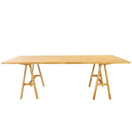 A light wood timber trestle table with exposed wood and A-frame legs that has a rustic feel. This 8′ trestle table is a banqueting size with extra width to accommodate centrepieces and sharing platters. This 8′ banquet trestle table can seat up to 12 people (4 down either side, and up to 2 at each end).