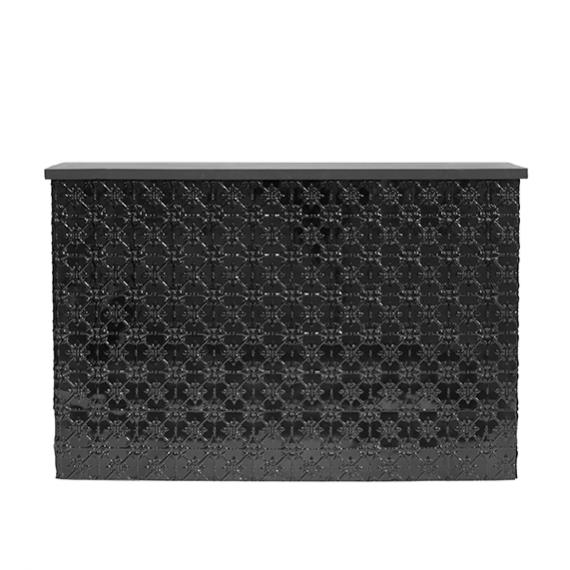 A gloss black pressed tin bar with a black wooden top, for serving drinks or for displaying platters or desserts.