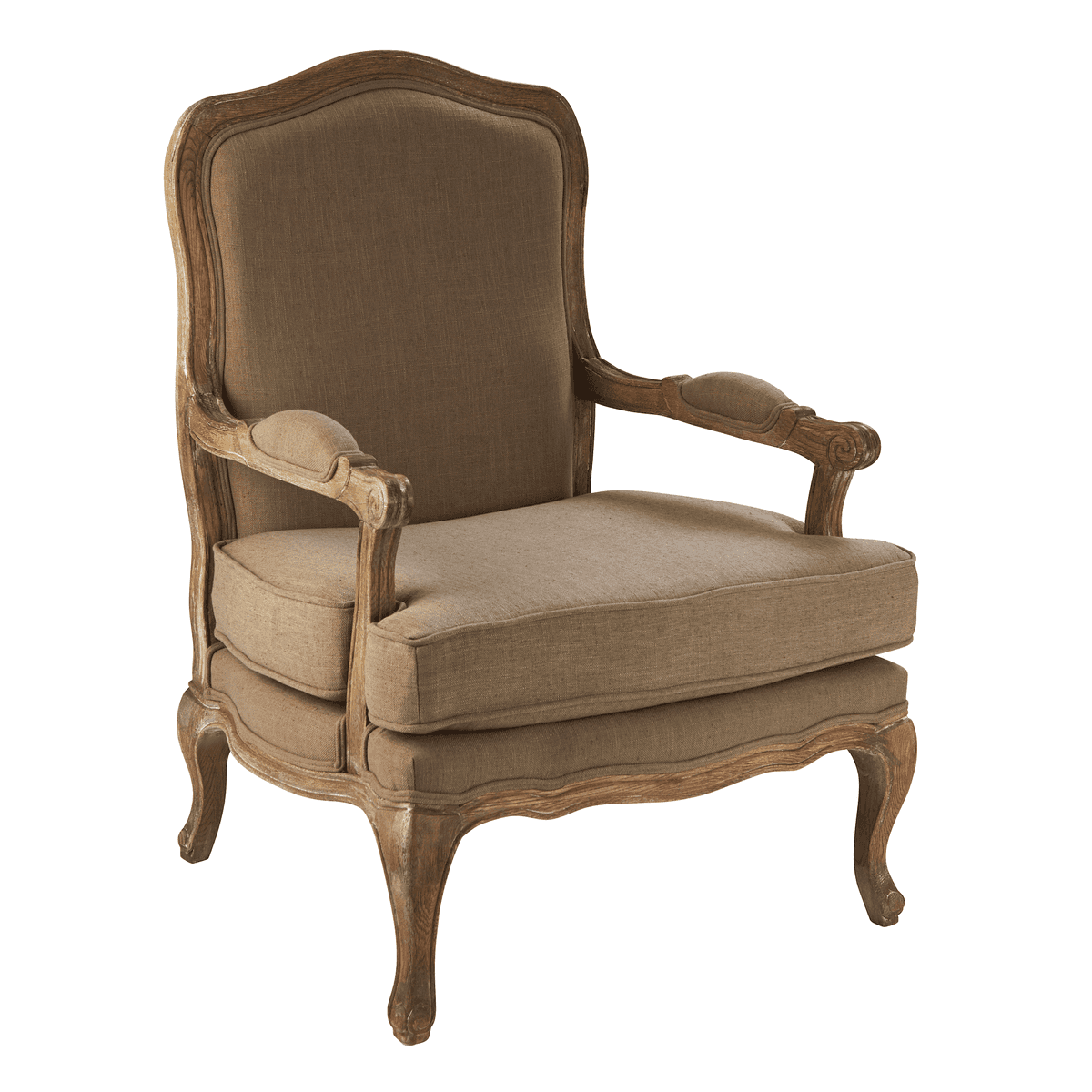 An elegant French-style armchair with an oak colour frame and a latte colour fabric.