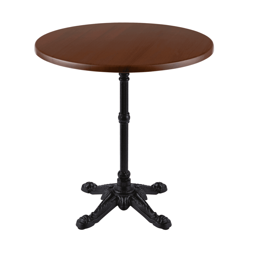 A statement cafe table with a heavy black cast iron base and mid-colour wood-effect top. This table seats 2-4 people: pair with the bentwood chair for an elegant function. This cafe table measures 70 cm diameter. Matching high bar tables are also available.