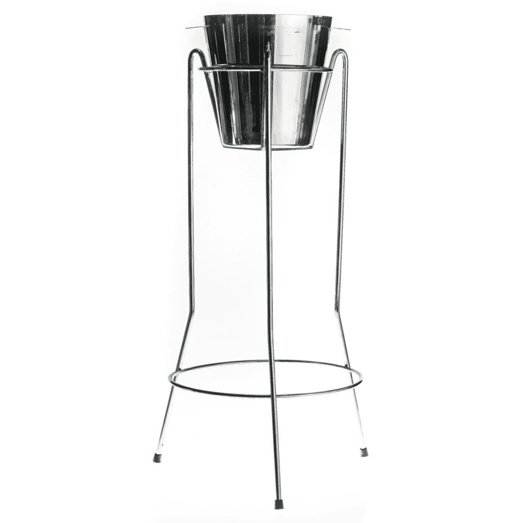 A traditional champagne bucket stand that holds a bucket for a single bottle on ice. This cost is for the stand alone. Stainless steel champagne buckets are available for hire separately.