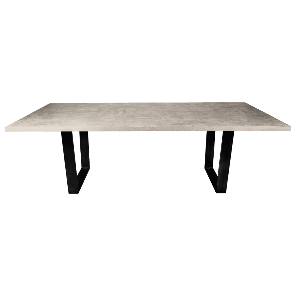 A modern dining table with a concrete look top and matte black legs. Measures 2.4m L x 1.1m D