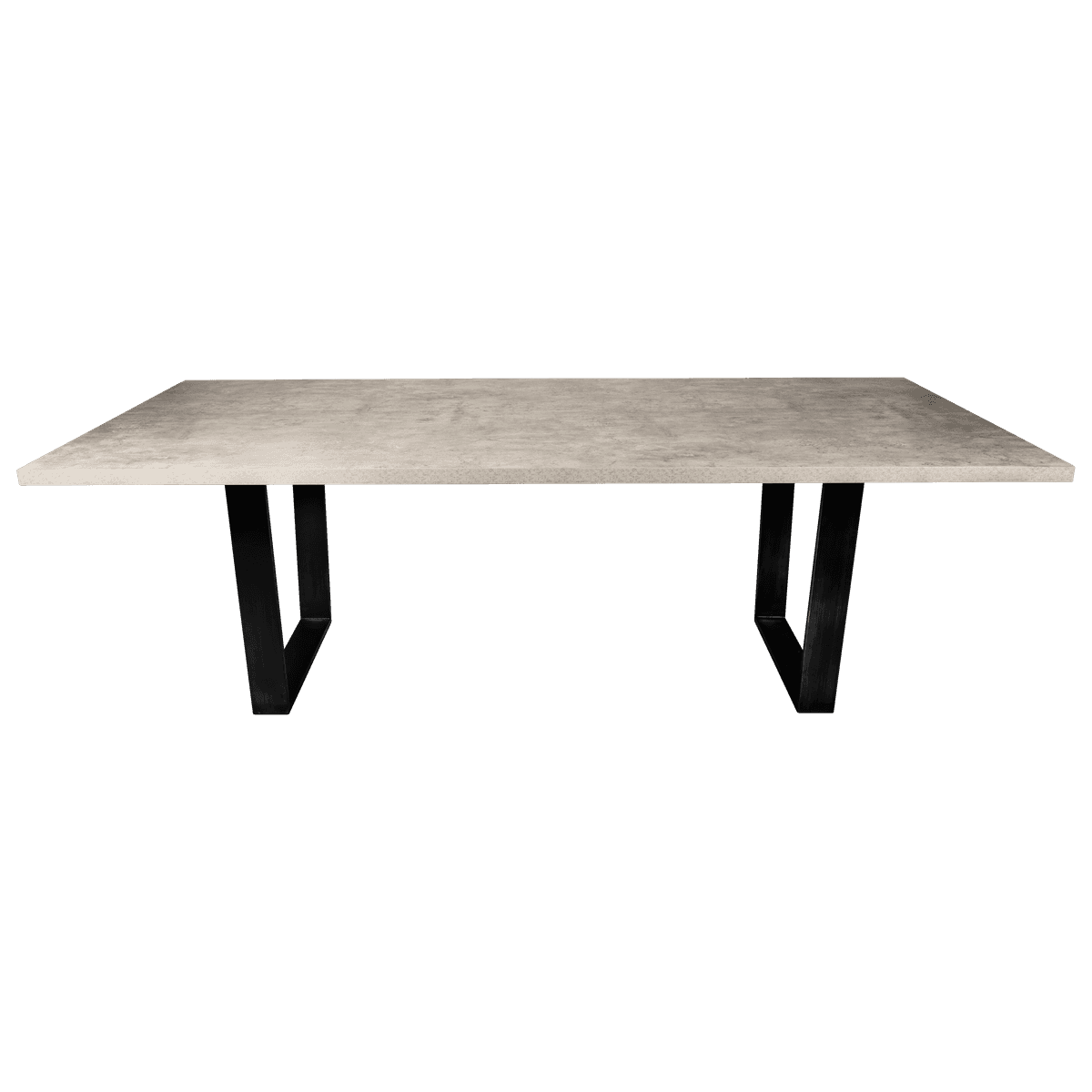 A modern dining table with a concrete look top and matte black legs. Measures 2.4m L x 1.1m D