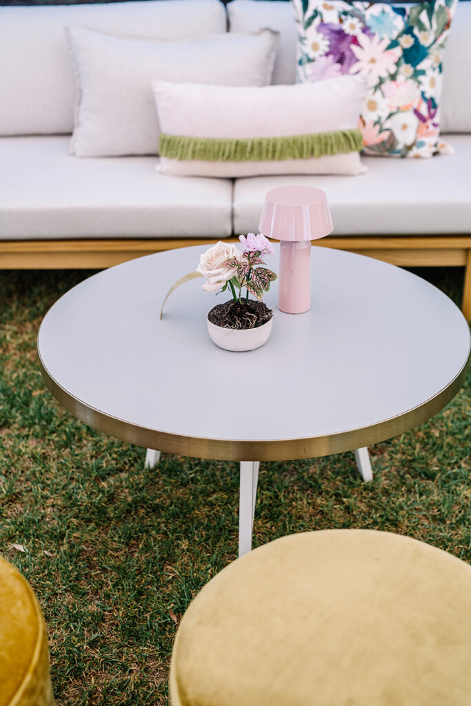 Modern and minimal, this coffee table feature a concrete look top with a brass edging plus a metal base in white. Also available in Black. Measures 80cm W x 45cm H