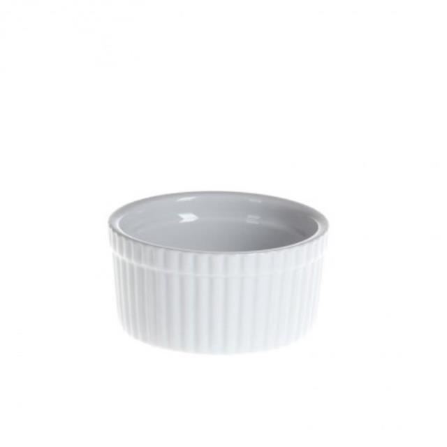 A small, ovenproof, white ceramic crème brûlée dish.