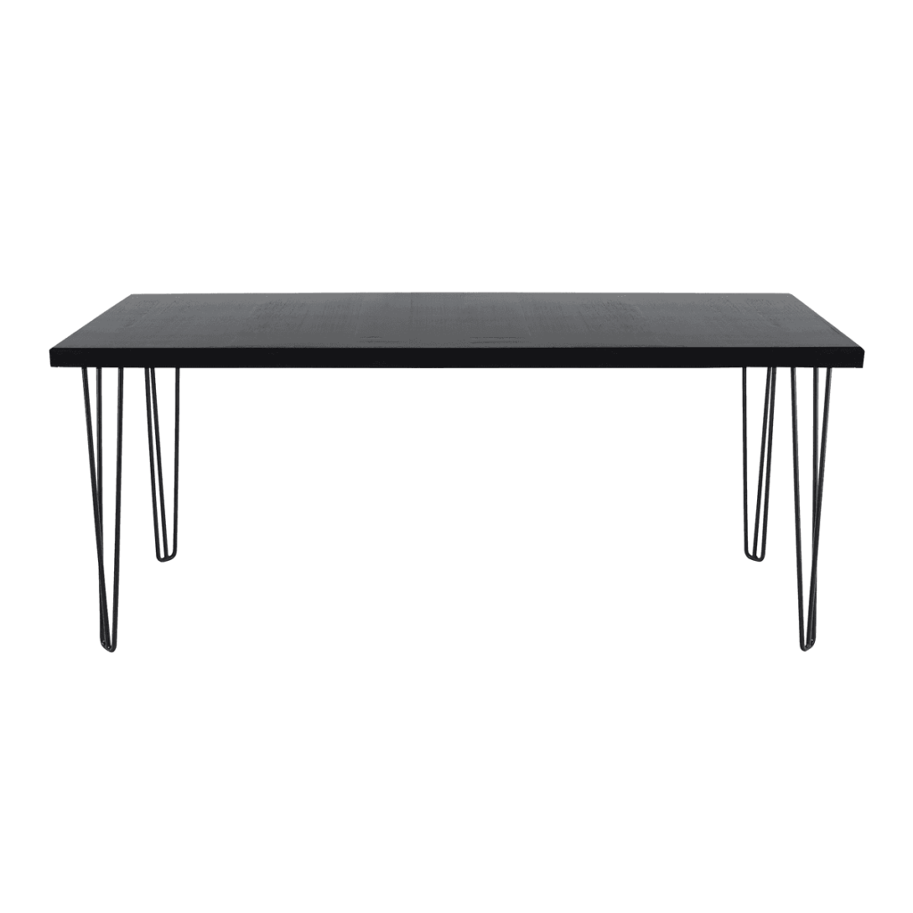 A modern contemporary occasional table with a striking black timber top and black hairpin legs. This bar table measures 1.8 m long x 0.7 m wide, and is a standard 0.75 m high. This table seats up to 6 people (3 on each side) in an informal setting.