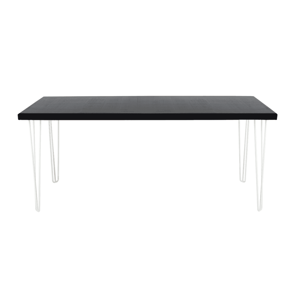 A modern contemporary occasional table with a striking black timber top and white hairpin legs. This bar table measures 1.8 m long x 0.7 m wide, and is a standard 0.75 m high. This table seats up to 6 people (3 on each side) in an informal setting.