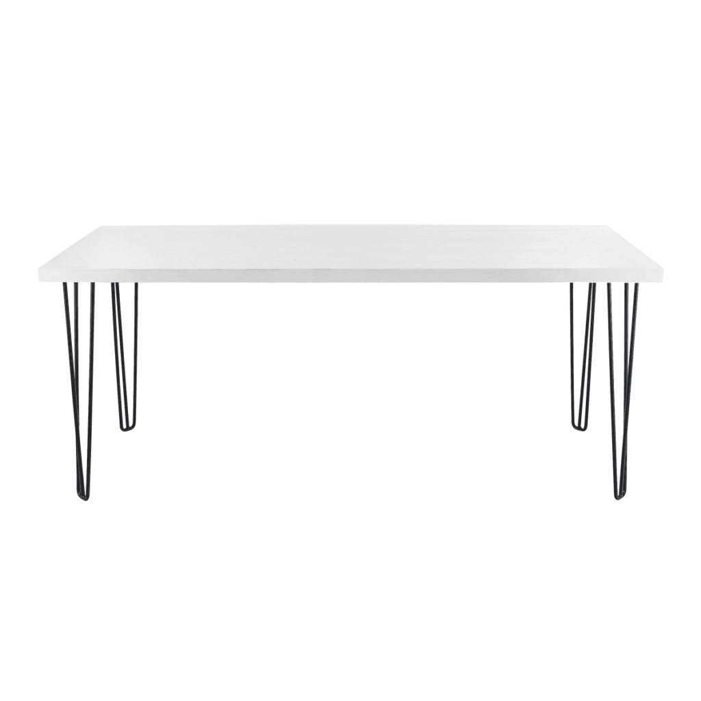 A modern contemporary occasional table with a modern white timber top and black hairpin legs. This bar table measures 1.8 m long x 0.7 m wide, and is a standard 0.75 m high. This table seats up to 6 people (3 on each side) in an informal setting.