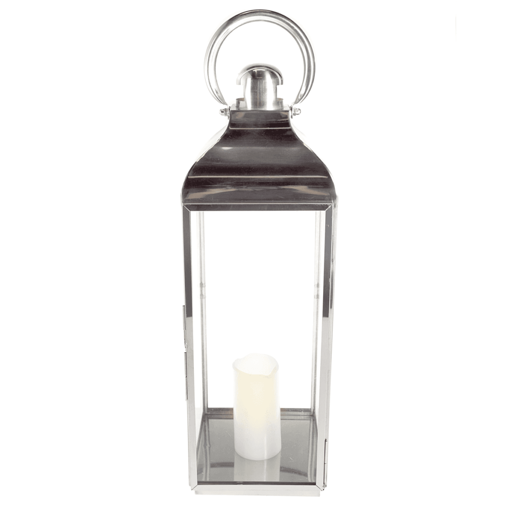 A sturdy lantern with a metal frame and glass panels. These silver lanterns look fabulous lining a path or aisle, or as a table centrepiece. Simply elegant with flickering LED candles, the lanterns also look stunning filled with fresh flowers. This large lantern is 60 cm tall (not including handle). A smaller lantern in the same style is also available for hire.