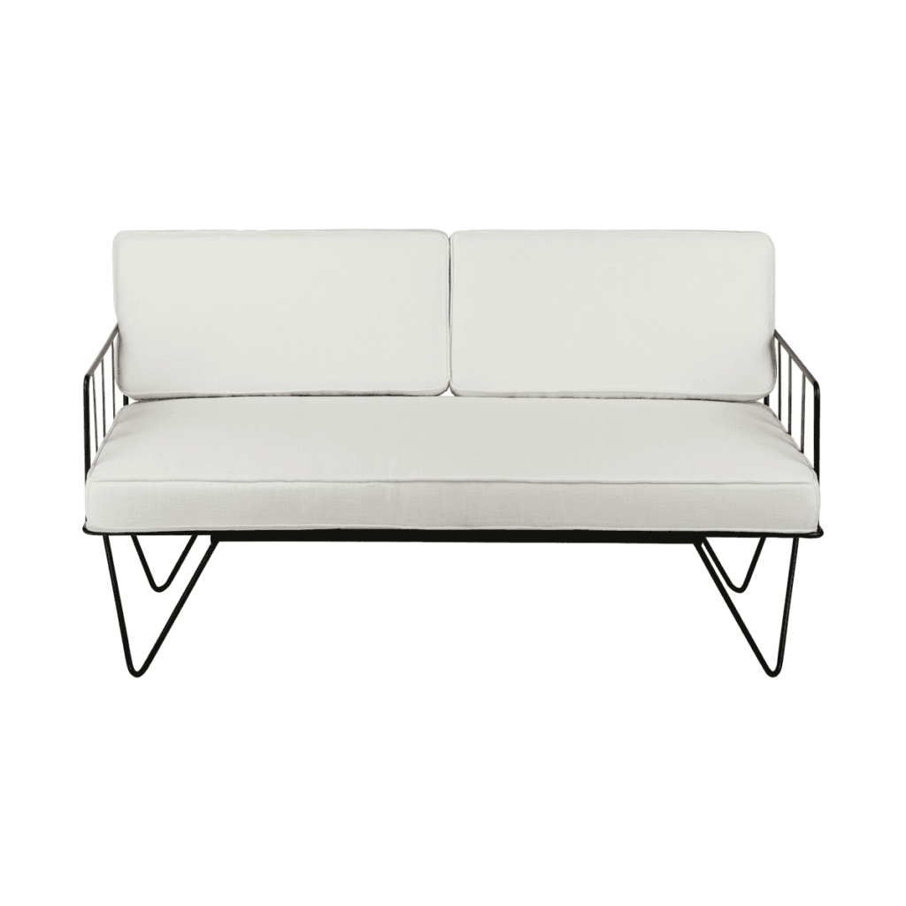 A contemporary hairpin black wire 2-seater sofa lounge, with white cushions. This sofa is also available in white, and with tan and charcoal cushions.
