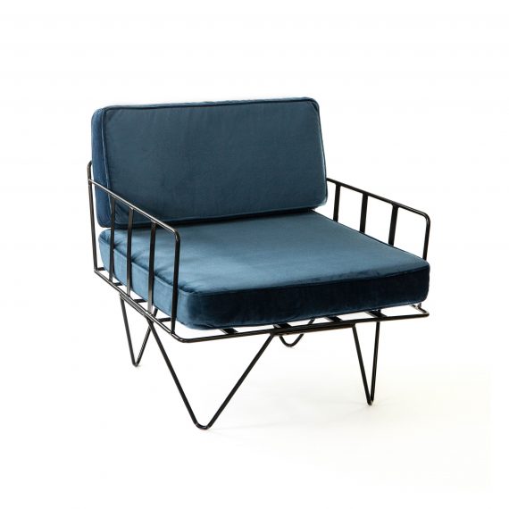Linear Wire Single Seater Chair – Black With Blue Velvet Cushions