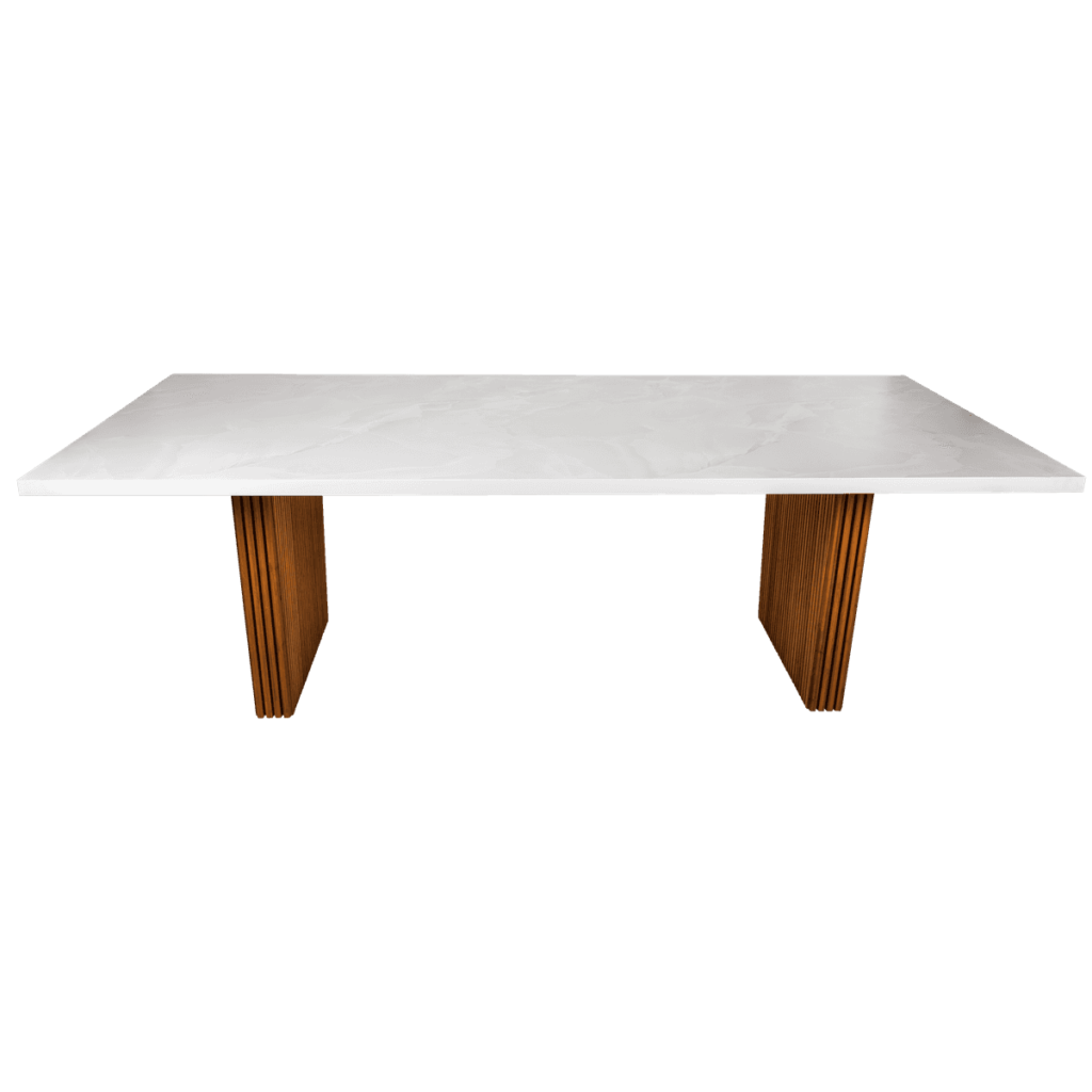 A modern dining table with a marble look top and wide bamboo legs. Measures 2.4m L x 1.1m D