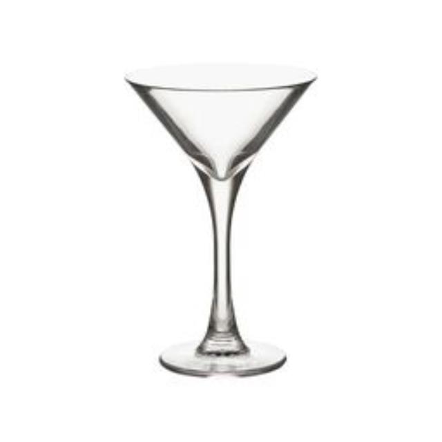 A rigid polycarbonate martini cocktail glass that is suitable for outdoor events.