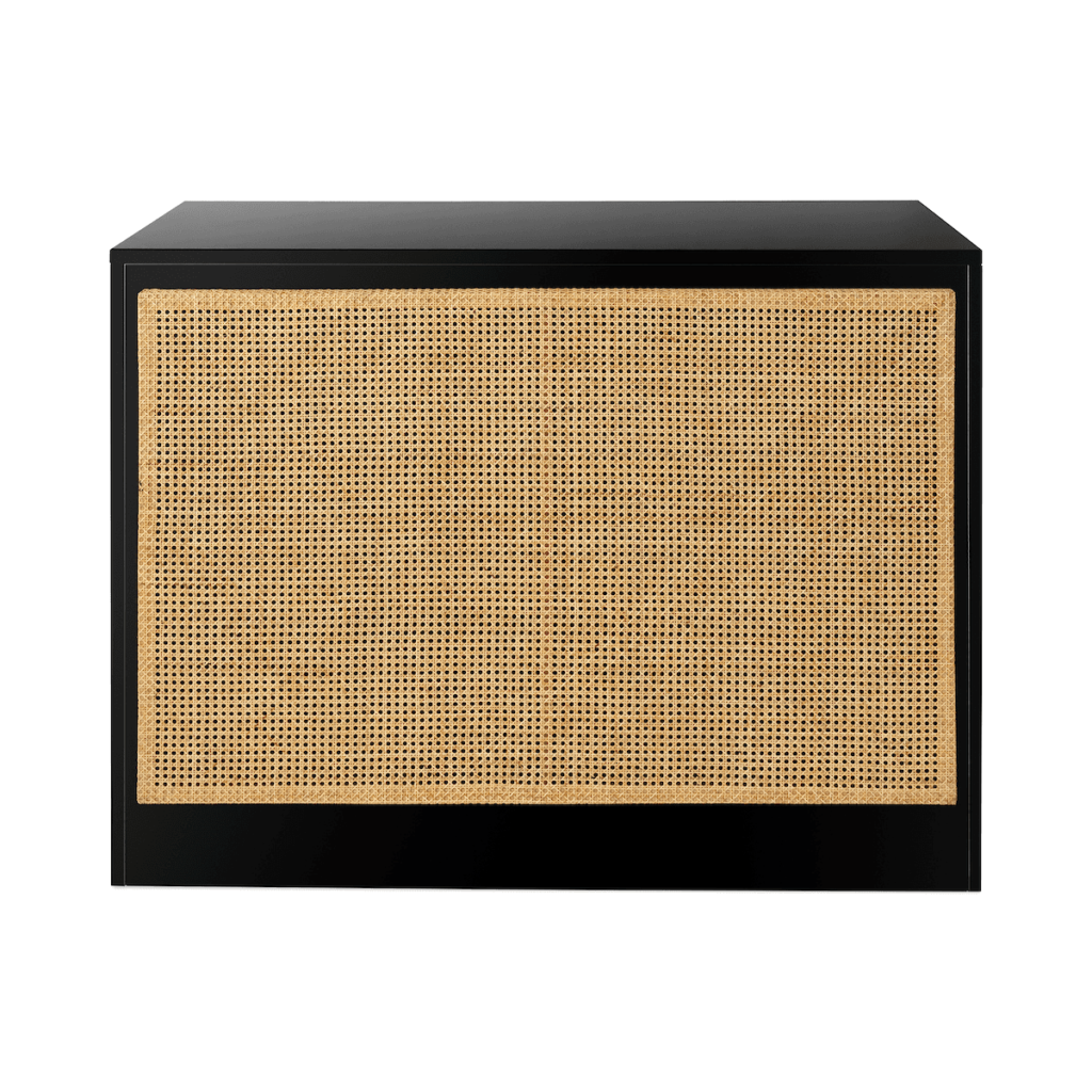 A contemporary bar with a black gloss finish and rattan insert feature. Perfect for serving drinks or as a canape, cake or dessert station. Includes an internal shelf. Also available in white gloss and rattan.