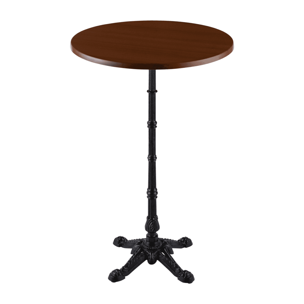 A statement dry bar table with black cast iron base and mid-colour wood-effect top. Matching cafe tables are also available. Pair with the bentwood stool for an elegant cocktail function. Measures 111cm tall, 70cm diameter.