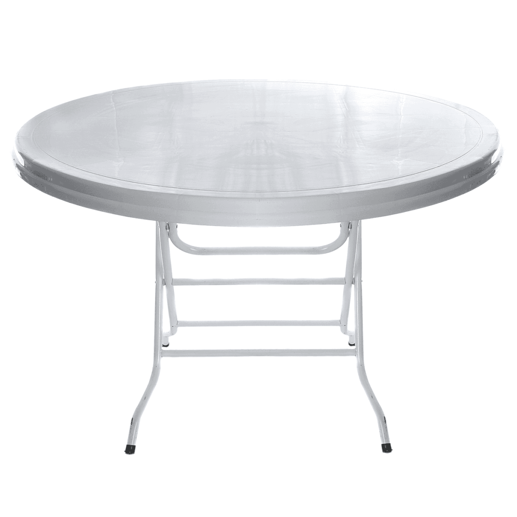 A small round table with a plastic top and metal legs which will seat 4-6 people comfortably. Can be covered with a round 9′ (2.7 m) tablecloth to create a full length drop to the floor.