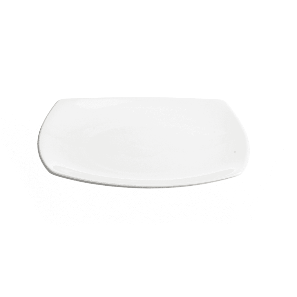 An Asian-inspired white square dinner plate with rounded corners that is ideal for a contemporary setting. This plate has a diameter of 27 cm.