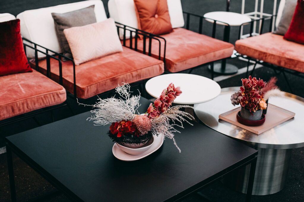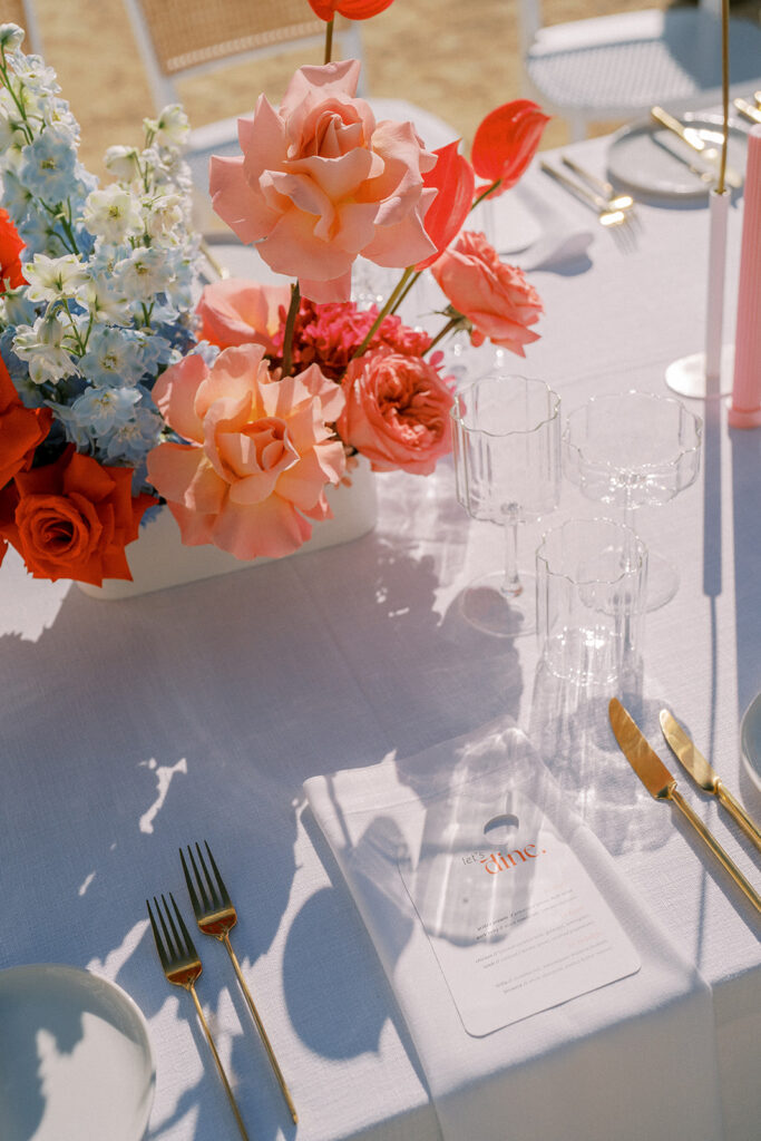 Florals on the ceiling, floors, tables and walls – there is no limit! Think whites, neutrals, soft pinks and apricots. Depending on your budget you can work with your florist to focus on quality over quantity and still make a big impact! Such as individual flower vessels along the tables.