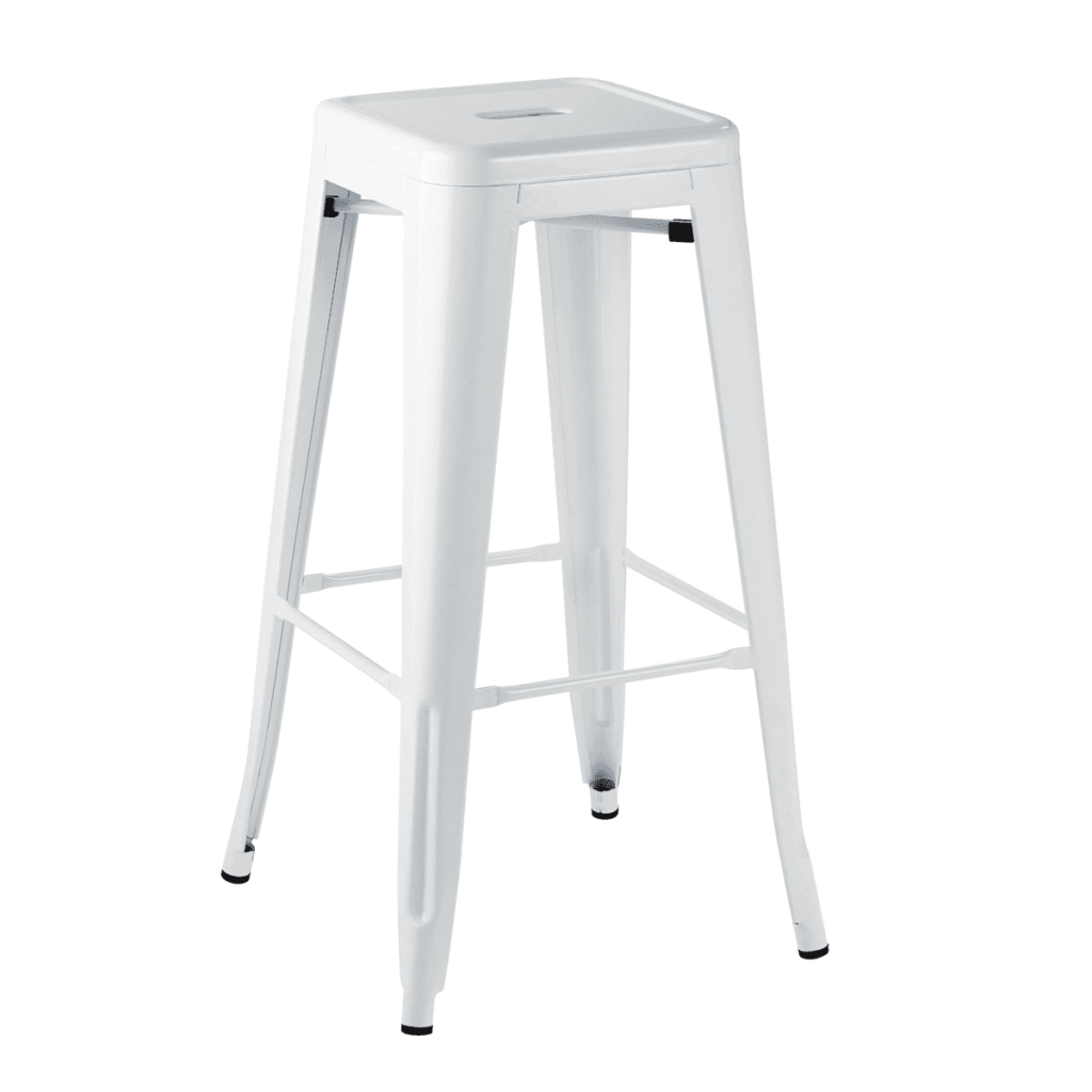 A tall, modern, industrial look bar stool from our Tolix range, which is powder-coated in white. This stool pairs well with our cocktail furniture and bench bars. Tolix bar stools are also available to hire in silver, black and red. This stool has a height of 77 cm. Shorter table-height Tolix stools and Tolix chairs are also available in white to hire.