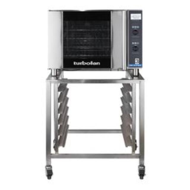 A commercial turbo fan oven fixed onto a rolling transport stand, and fitted with four storage shelves. The oven can hold 4 x full shallow inserts without removing wire shelves. No baking trays are included: they are available to hire separately if required