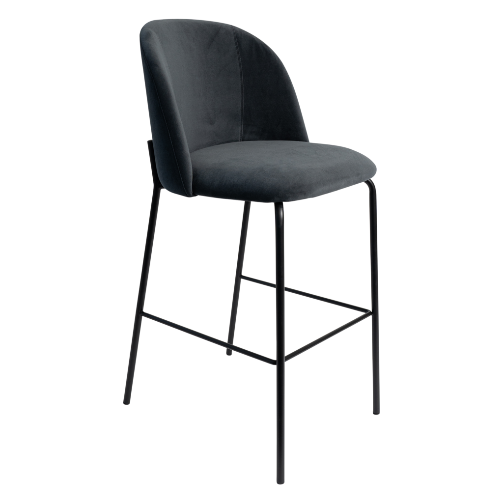An upholstered bar stool redefined for modern entertaining with a beautifully rounded back in charcoal and matte black legs. Inspired by the popular mid century silhouette created by Copenhagen-based design firm Gubi.