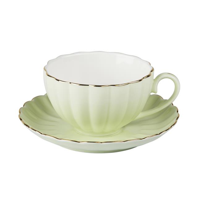 A beautiful scalloped mint green tea cup with a gold trim and matching saucer that can be mixed and matched with other items in our vintage range for an eclectic high tea.