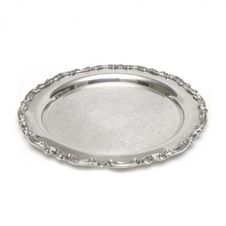 A medium-sized ornate silver tray.