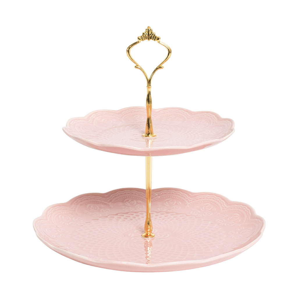 An elegant pink cake stand with a scallop trim. Why not mix and match with the other coloured items in our vintage range for an eclectic high tea?