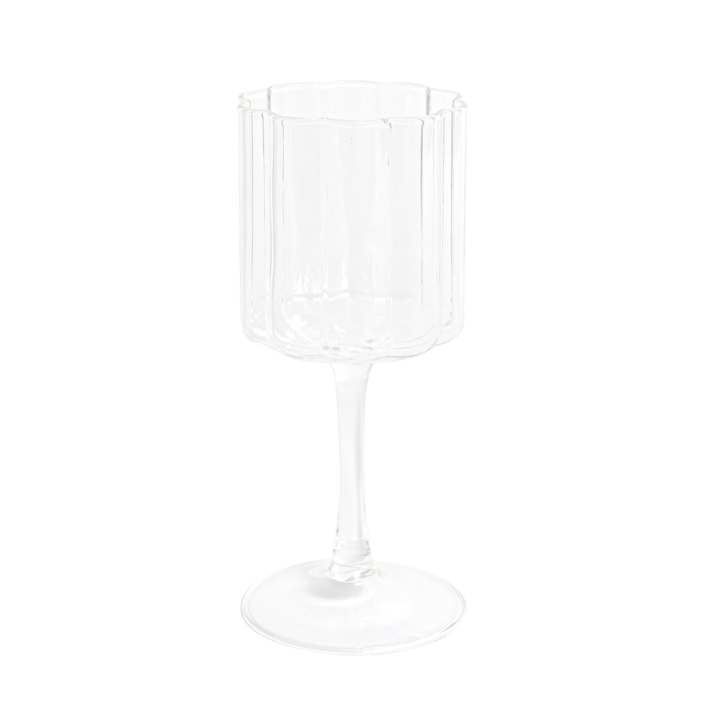 The wave wine glass in clear features, a curved scallop shape and is a statement to any table setting.