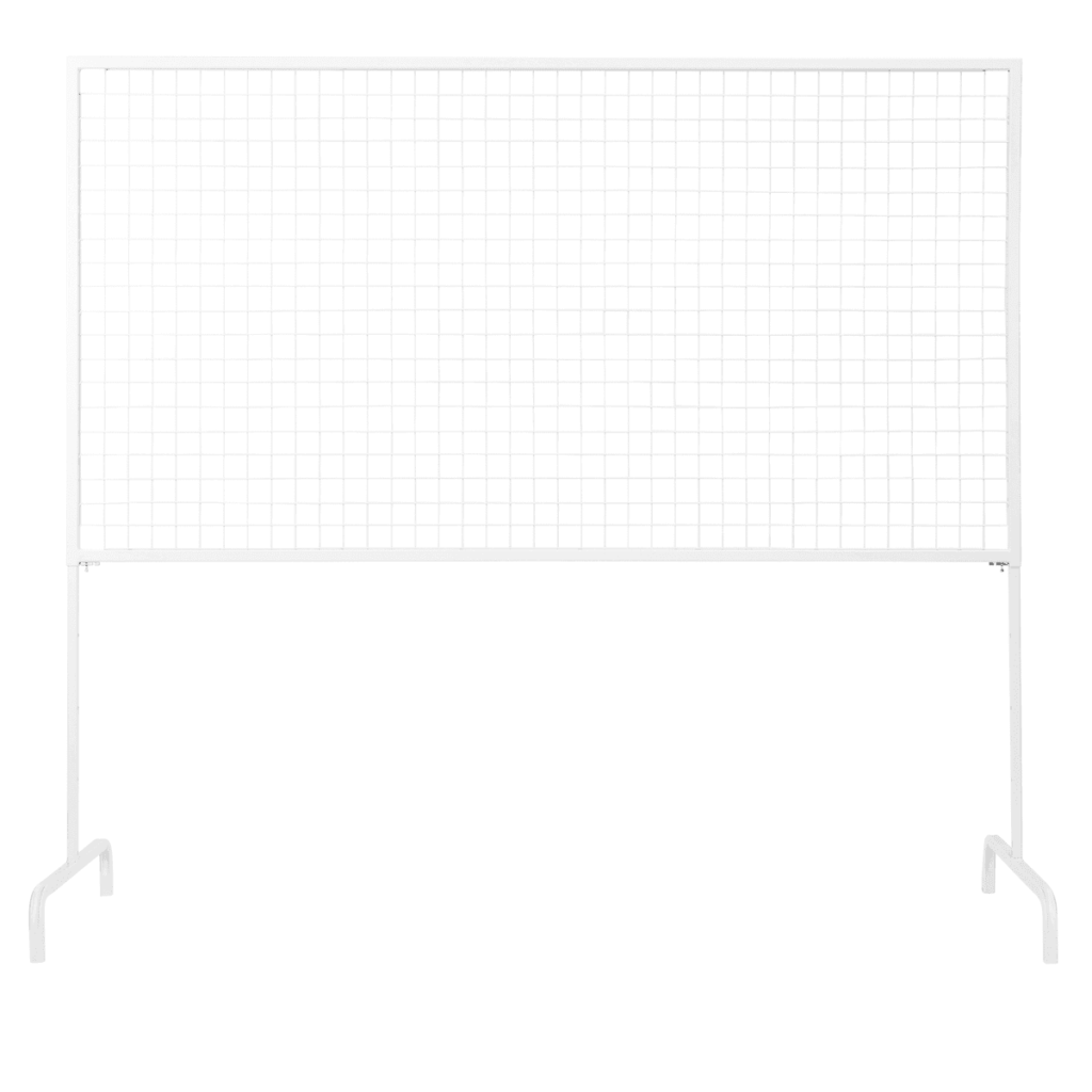 A white wire mesh on a sturdy frame that is fully height adjustable. The wire mesh can be strung with flowers, foliage and lights to create a beautiful backdrop.